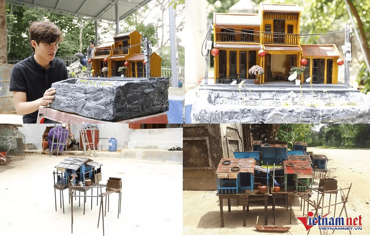 Most of Tung’s mini scenes retrace life in the past of Mekong Delta’s people, from wooden houses floating on rivers to boats people use to travel to women in ao ba ba (loose fitting blouse) and items such as clothes, tables and chairs, bookcases, water jars, flower pots, and stairs. There are also coils of rope and stones on the roof. Tung also recreates scenes of old and new Hoi An.