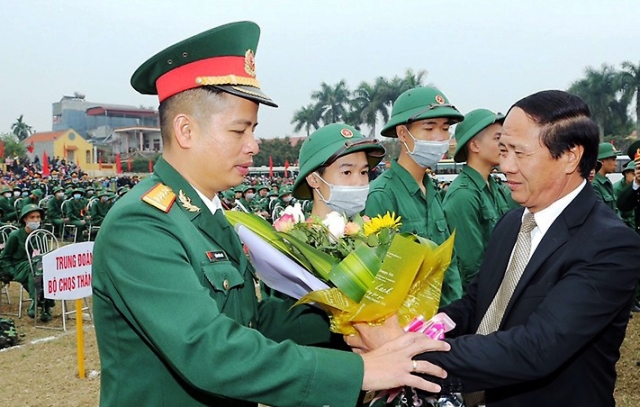 Leaders of Ha Nam Province present flowers to new recruits in Duy Tien Commune, Ha Nam Province.