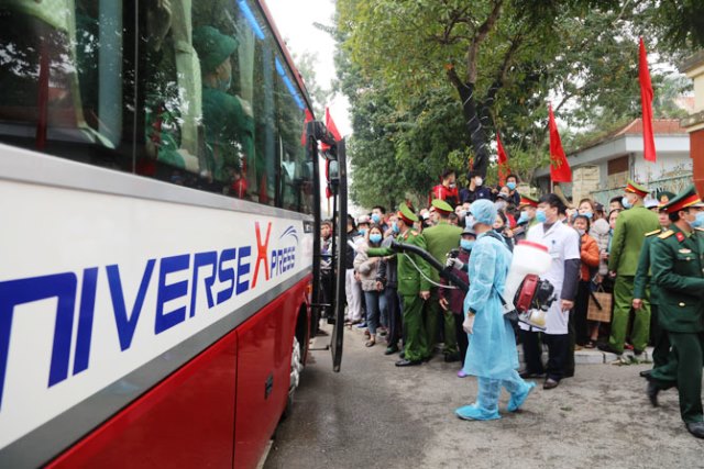 Bus transferring new recruits is sprayed with disinfectant solution.