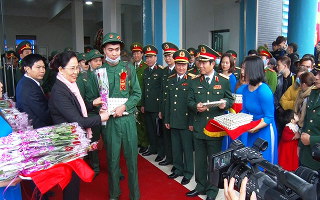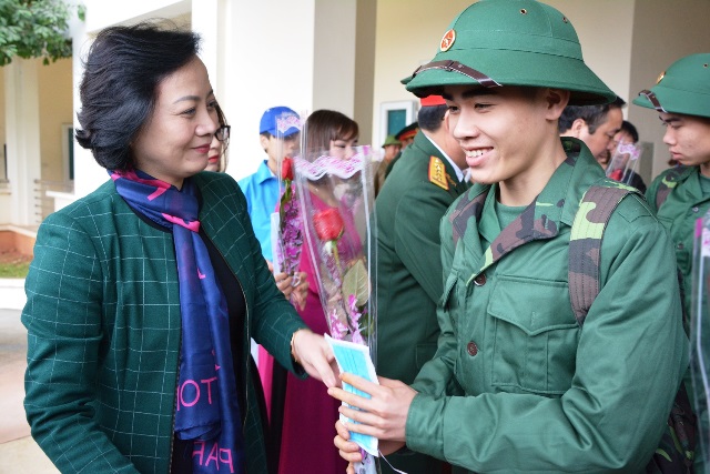 Member of the Party Central Committee and Secretary of the Yen Bai Provincial Party Committee Pham Thi Thanh Tra presents flowers to new conscripts in Yen Binh District.