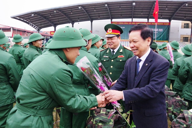 Secretary of the Hoa Binh Provincial Party Committee Bui Van Tinh presents flowers to new recruits in the province.