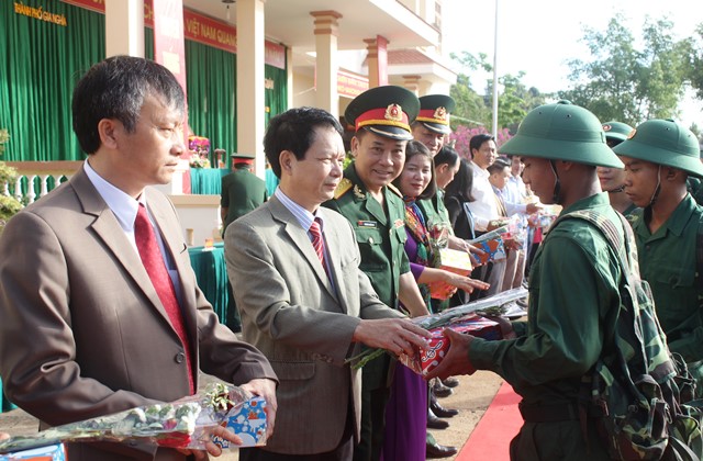 Leaders of Gia Nghia city, Dak Nong Province, present flowers to the new recruits.