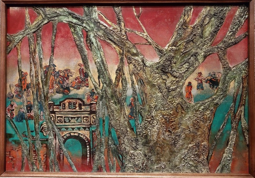 | The village, lacquer painting with carving technique by Nguyen Ha Anh. |