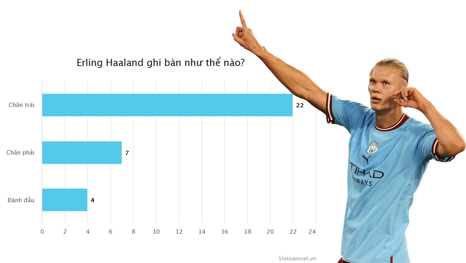 Phong độ này giúp anh đang dẫn đầu cuộc đua Chiếc giày vàng châu Âu, với 56 điểm. Haaland bỏ xa người đứng thứ hai là Victor Osimhen, tác giả 19 bàn thắng cho Napoli ở Serie A, có 38 điểm.