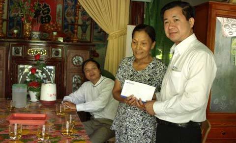 | Đại diện Eurowindow đến thăm hỏi và trao sổ tiết kiệm cho bà Phan Thị Trúc - thương binh hạng 3/4 |