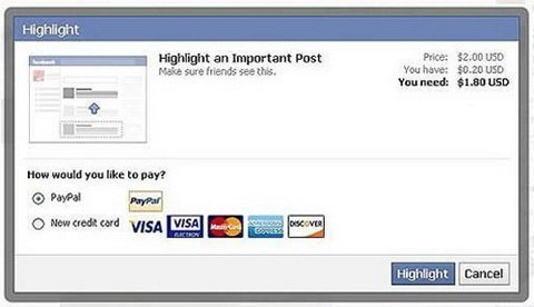 Facebook đang tiến gần đến con số 1 tỉ người dùng và mạng xã hội này bắt đầu thử nghiệm giải pháp để người dùng mở hầu bao của mình nhằm thu hút sự chú ý nhiều hơn cho chính họ. Facebook đã bắt đầu thử nghiệm tại New Zealand và sẽ mở rộng ra nhiều quốc gia khác.