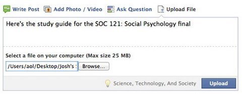 Các nhóm (groups) trên Facebook sẽ có thể chia sẻ dữ liệu với nhau với mức dung lượng bị giới hạn ở 25 MB và không được chia sẻ các tập tin nhạc số hay dữ liệu có bản quyền và tập tin thực thi (*.exe).