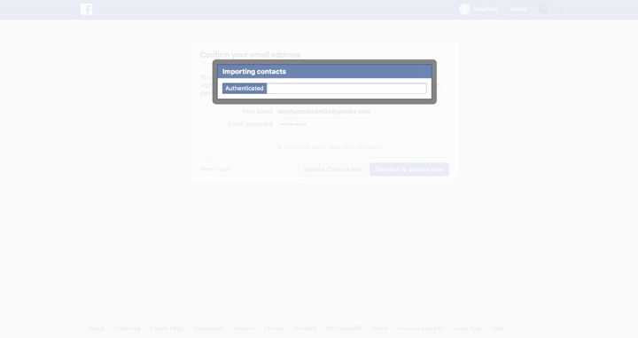 Nguồn tin của trang Business Insider cũng đã phát hiện ra rằng nếu một người mới đăng ký quyết định nhập mật khẩu tài khoản email của mình vào Facebook, một cửa sổ pop-up xuất hiện và thông báo Facebook đang "nhập danh bạ" dù không xin phép người dùng làm điều trên. Vẫn chưa rõ liệu công cụ này có thực sự nhập các danh bạ hay không vì có vẻ Facebook không lấy các mục trong danh sách liên lạc được người viết nguồn tin trang Business Insider tạo ra nhằm mục đích kiểm tra dù các thông tin liên lạc này mới lập được có vài phút.