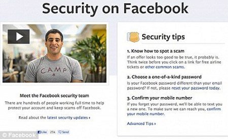 Sau đó, bạn sẽ được dẫn đến một trang an ninh riêng trên Facebook, sẽ được hỏi để điền một password nào đó do bạn tự đặt và hướng dẫn bạn cách phát hiện lừa đảo trực tuyến.