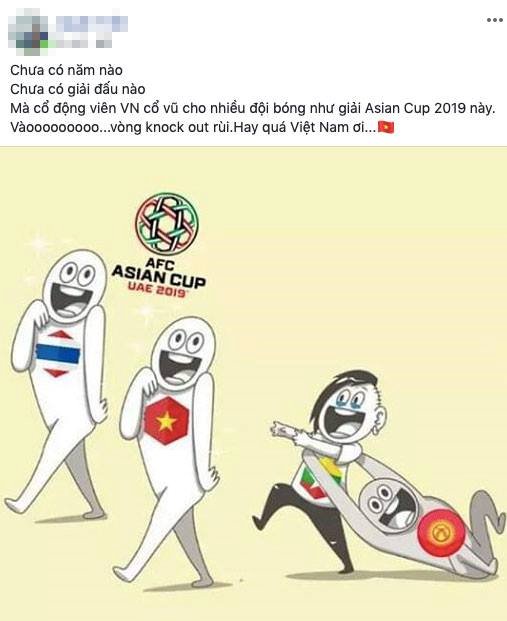 Facebook sáng 18/1 phủ đầy các status về tuyển Việt Nam giành quyền vào vòng 1/8 Asian Cup 2019. Các bình luận hài hước, những lời chúc mừng và các dự đoán táo bạo đã được người hâm mộ đốt nóng mạng xã hội.