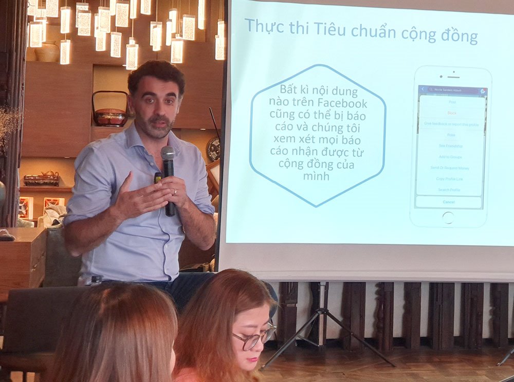 Ông Simon Harari, Giám đốc phụ trách Chính sách nội dung, Facebook Châu Á Thái Bình Dương, có buổi gặp với một số phóng viên Việt Nam hôm 17/6 nhằm chia sẻ về bộ tiêu chuẩn cộng đồng của Facebook.
