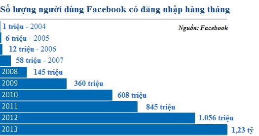 Cuối năm 2013, Facebook công bố đã có 1,23 tỷ người dùng có đăng nhập hàng tháng trên toàn cầu, tăng 170 triệu người dùng so với một năm trước. Theo Facebook, tính đến ngày 31/12/2013, 757 triệu người dùng đang đăng nhập Facebook mỗi ngày.