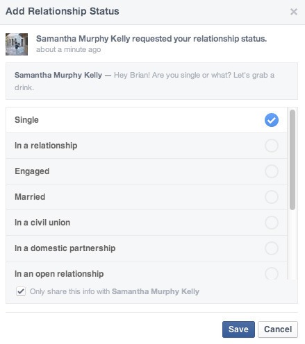 Sau đó, chủ nhân của trang Facebook sẽ nhận được yêu cầu chọn trạng thái mối quan hệ mà chỉ người hỏi mới nhìn thấy.