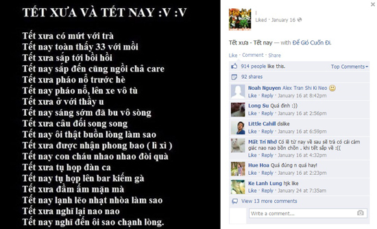 Cư dân mạng còn chế ra những bài thơ, những đoạn clip so sánh Tết xưa với Tết nay. Mặc dù có phần tiêu cực đối với Tết nay nhưng những “tác phẩm” này thể hiện rõ sự trân trọng đối với những giá trị truyền thống.