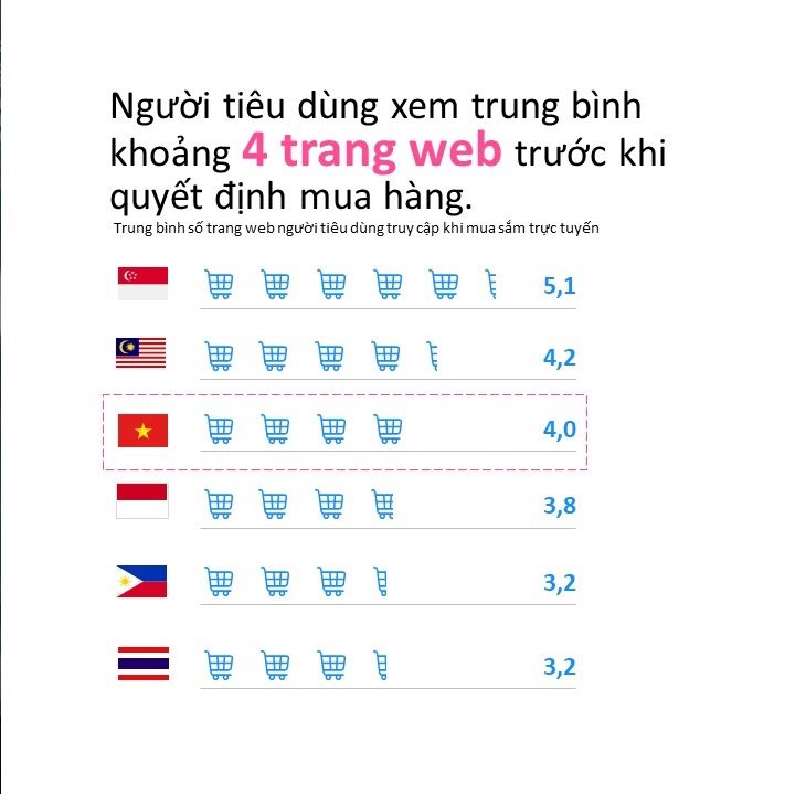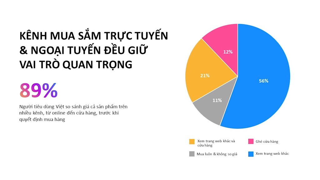 Việc tìm kiếm thông tin đóng một vai trò quan trọng, bởi có tới 68% số người tham gia khảo sát tại Việt Nam cho biết họ không biết chính xác họ sẽ mua gì hay mua ở đâu trước khi mua hàng online, 48% chia sẻ họ tìm hiểu thông tin về sản phẩm, nhãn hàng mới qua các nền tảng xã hội. Người mua hàng Đông Nam Á đặc biệt ưa thích mua sắm đa kênh, đặc biệt là người Việt Nam, với 89% số người được hỏi cho rằng họ luôn so sánh giá cả giữa các kênh online và giá tại cửa hàng trước khi quyết định mua hàng. Đáng lưu ý là cứ 3 người Việt thì có 1 người ghé thăm cửa hàng để so sánh sản phẩm trước khi mua online, cho thấy cửa hàng truyền thống vẫn đóng một vai trò quan trọng trong hành trình mua sắm của người Việt.