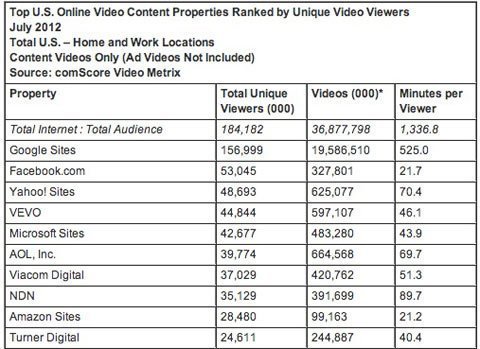 Số liệu của comScore cho thấy lượng người xem video trên Facebook trong tháng 7 vừa qua đạt 53 triệu người, nhỉnh hơn một chút so với lượng người xem trên Yahoo là gần 49 triệu người. Vững vàng đứng đầu danh sách vẫn là Google, nhờ sự phủ rộng của mạng xã hội chia sẻ video lớn nhất thế giới Youtube đã bỏ xa Facebook và Yahoo khi sở hữu lượng người xem lên tới gần 157 triệu người.