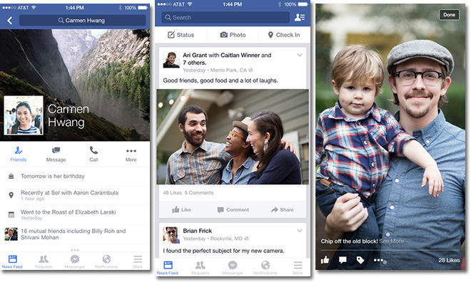 Mạng xã hội Facebook cũng nhanh chóng cập nhật lên phiên bản 16.0 với những tinh chỉnh ở mặt đồ họa để tối ưu cho kích thước mới của iPhone (4,7 inch của iPhone 6 và 5,5 inch của iPhone 6 Plus).
