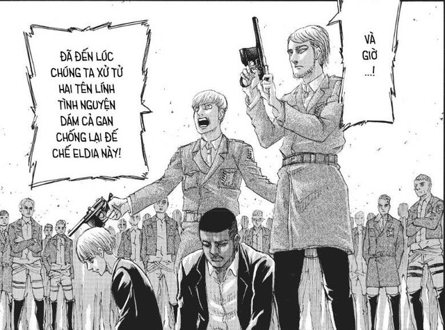 Ví dụ rõ ràng nhất đó chính là trường hợp của những người tình nguyện viên đến giúp sức cho Paradis suốt thời gian qua. Giờ đây khi họ không chịu giúp vì Eren đang đem Titan ra thảm sát gia đình họ bên kia đại dương, thì bọn họ lại bị đem ra xử bắn không khác gì cỏ rác. Thử hỏi xem, công lý ở đâu cho lý tưởng của fan Eren.