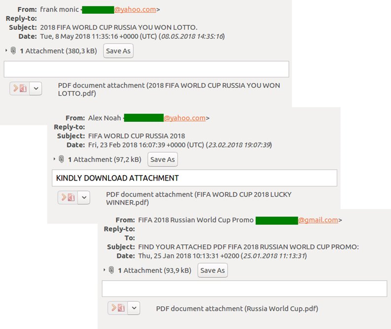 Các chuyên gia Kaspersky Lab đã xác định được email lừa đảo từ những kẻ chuyên cung cấp “vé mời” cho người hâm mộ đến FIFA World Cup 2018 với mức giá cao hơn so với mức họ có thể chi trả.
