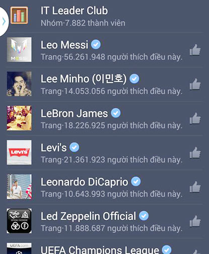 Không chỉ đối với các nghệ sỹ, thương hiệu tại Việt Nam, nhiều nghệ sỹ, thương hiệu lớn của nước ngoài hiện cũng đã được “đánh dấu chính chủ” tương tự trên Facebook như: thương hiệu Levi’s, nam tài tử Hollywood Leonardo DiCaprio, ngôi sao Hàn Quốc Lee Minho, fanpage của UEFA Champions League…