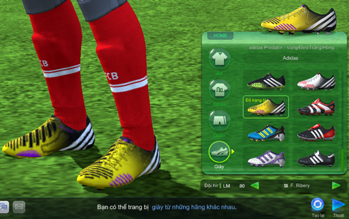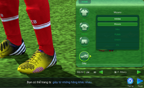 Có 6 nhóm kiểu giày cho người chơi tùy biến. Tại đây có các thương hiệu rất nổi tiếng của thế giới như Adidas, Nike, Umbro, PUMA, Mizuno… Đặc biệt, nếu là người “sành điệu” về giày dép, người chơi sẽ dễ dàng nhận ra các model giày rất nổi tiếng như Adidas Predator, AdiPure, NitroCharge, F50, Nike T90 Laser, Nike Tiempo, PUMA Power Cat…