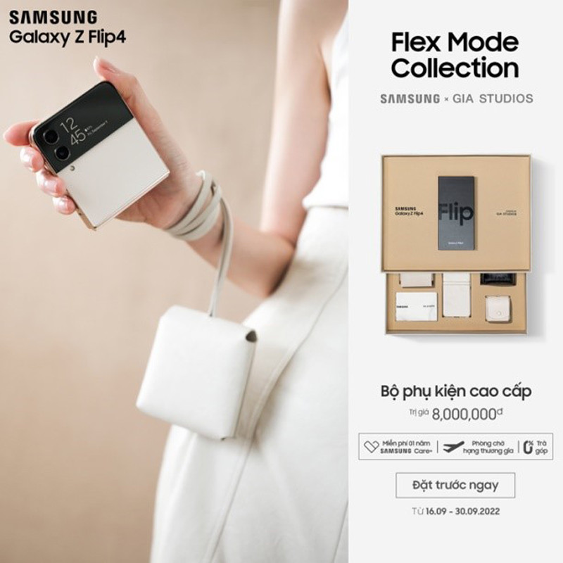 Bộ sưu tập giới hạn Samsung Galaxy Z Flip4 - The Flex Mode Collection là phiên bản thời trang mới nhất giữa Samsung x GIA STUDIOS, đánh dấu thêm một phiên bản thời trang đặc sắc được lấy cảm hứng từ chính thiết bị Galaxy Z Flip4. ![]() Phiên bản Samsung Galaxy Z Flip4 - Flex Mode Collection bắt đầu chương trình đặt hàng từ ngày 16 - 30/09/2022 với giá bán lẻ đề nghị: 25,990,000 VNĐ. Người dùng sở hữu bộ sưu tập còn nhận ngay trọn bộ ưu đãi bao gồm: – Tặng ngay phiếu mua hàng trị giá 2.000.000 đồng – Tặng kèm gói Bảo hành mở rộng Samsung Care+ 1 năm trị giá 4.000.000 đồng – Dịch vụ phòng chờ hạng thương gia tại sân bay – Trả góp 0% qua nhà tài chính hoặc thẻ tín dụng ngân hàng |