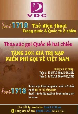 Gọi điện thoại quốc tế hai chiều cùng chung trên một tài khoản của Fone1718 đặc biệt tiện lợi với du học sinh, người Việt Nam công tác hay sinh sống ở nước ngoài với giá cước chỉ từ 700 VNĐ/ phút. Việc đăng ký số điện thoại dùng chung với tài khoản Fone1718 ở Việt Nam thì thực hiện cuộc gọi đơn giản hơn: gọi vào Tổng đài truy cập rồi bấm số cần gọi mà không cần nhập mã số thẻ/mã PIN riêng.