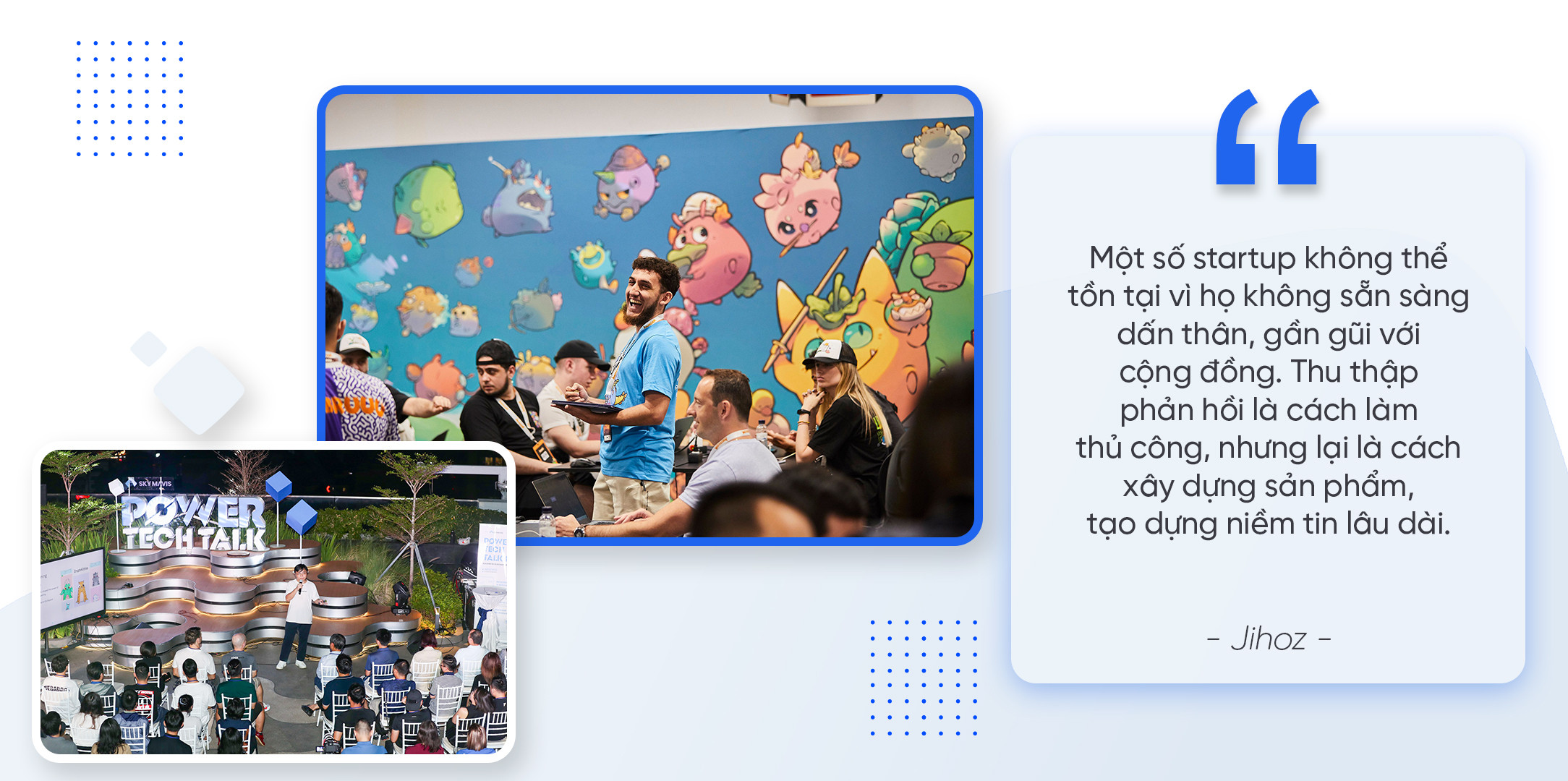 Ở giai đoạn tiếp theo, cách tiếp cận của Sky Mavis vẫn sẽ duy trì theo phương pháp từ dưới lên (bottom-up) thông qua giao tiếp, khảo sát trực tiếp người dùng. “Một số startup không thể tồn tại vì họ không sẵn sàng dấn thân, gần gũi với cộng đồng. Thu thập phản hồi là cách làm thủ công, nhưng lại là cách xây dựng sản phẩm, tạo dựng niềm tin lâu dài.”