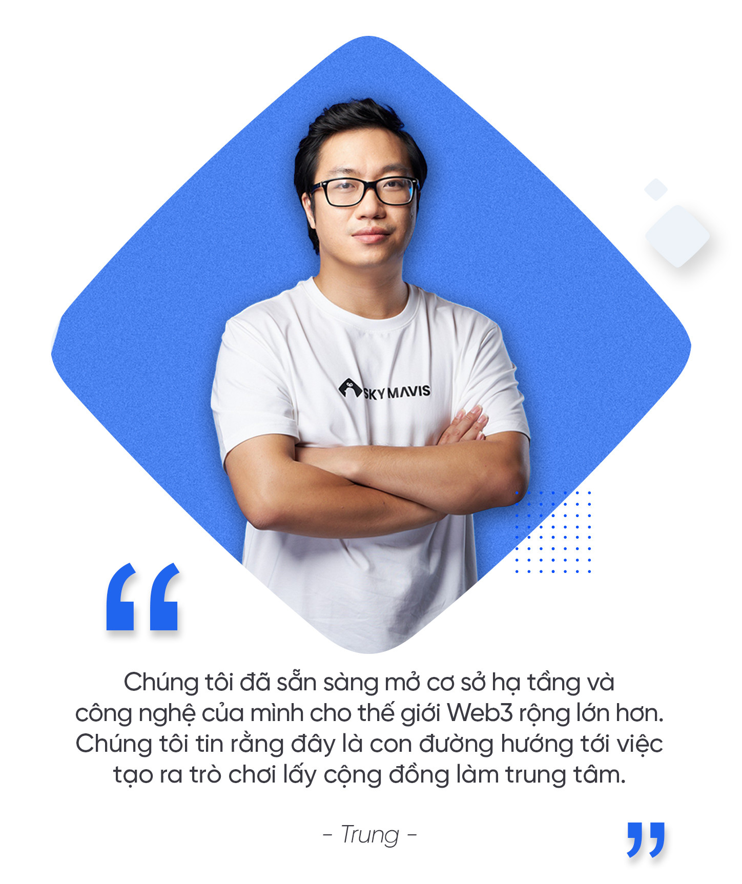 Trung luôn tin vào cách phân công nhân sự dựa trên thế mạnh và tài năng của mỗi cá nhân. Các nhân tố chủ lực được tổng hoà và điều phối nhịp nhàng để hướng tới mục tiêu lớn của tập thể. Đó cũng là lý do mà Sky Mavis có đến 5 thành viên sáng lập. Đối với các vấn đề đối ngoại, Jeffrey Zirlin (Jihoz) tràn đầy năng lượng cống hiến cho cộng đồng, Alek chững chạc, điềm đàm phụ trách gây quỹ và quan hệ nhà đầu tư. Trong khi Thành Trung, Việt Anh và Minh Tú - Giám đốc nghệ thuật, phụ trách xử lý các hoạt động nội bộ tại Việt Nam.