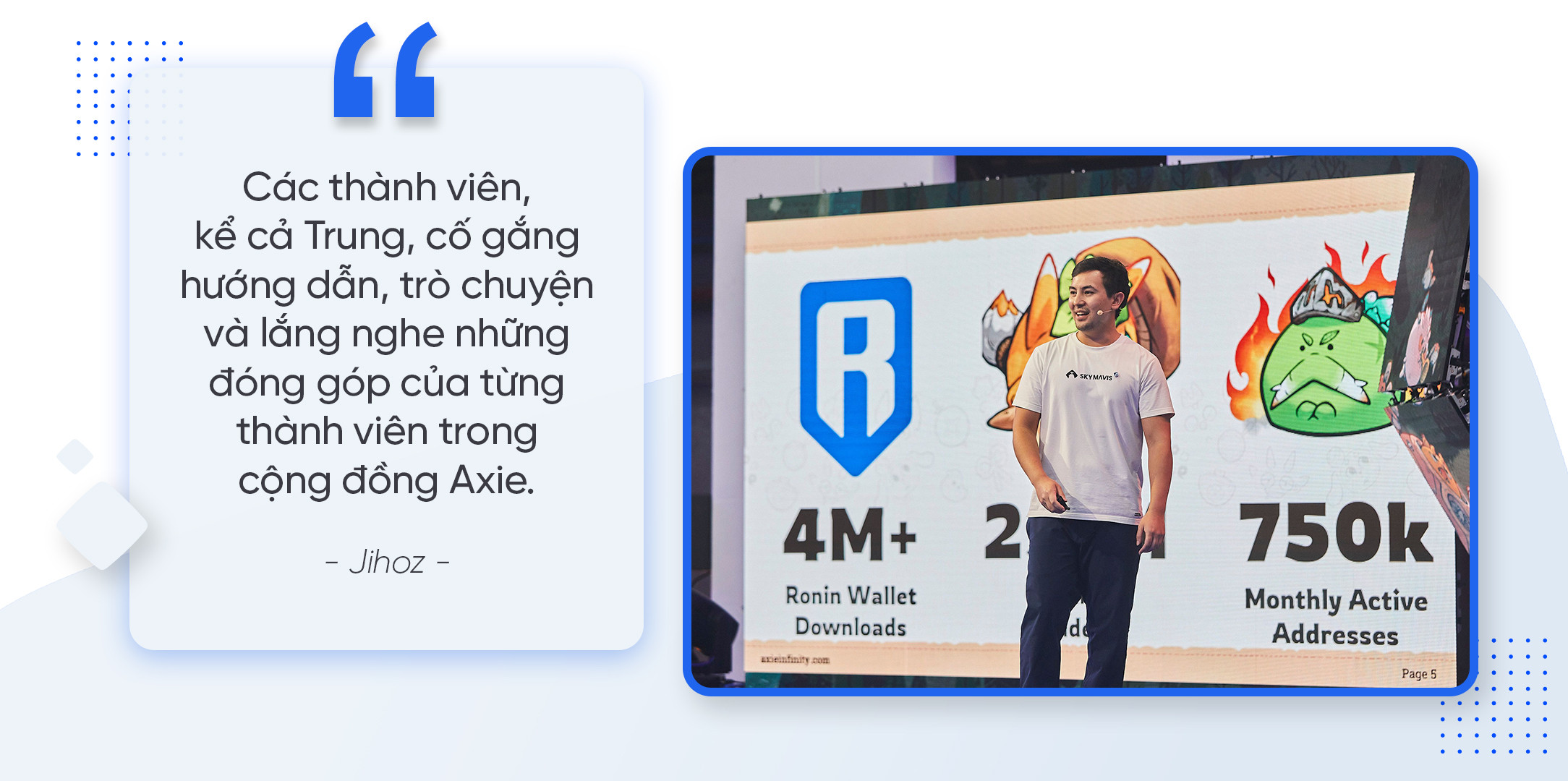 Khi đối mặt với thách thức, Jihoz chia sẻ, "Tất cả chúng tôi đã làm việc liên tục hàng ngày và gần như không có ngày nghỉ cho bản thân. Các thành viên, kể cả Trung, cố gắng hướng dẫn, trò chuyện và lắng nghe những đóng góp của từng thành viên trong cộng đồng Axie.”