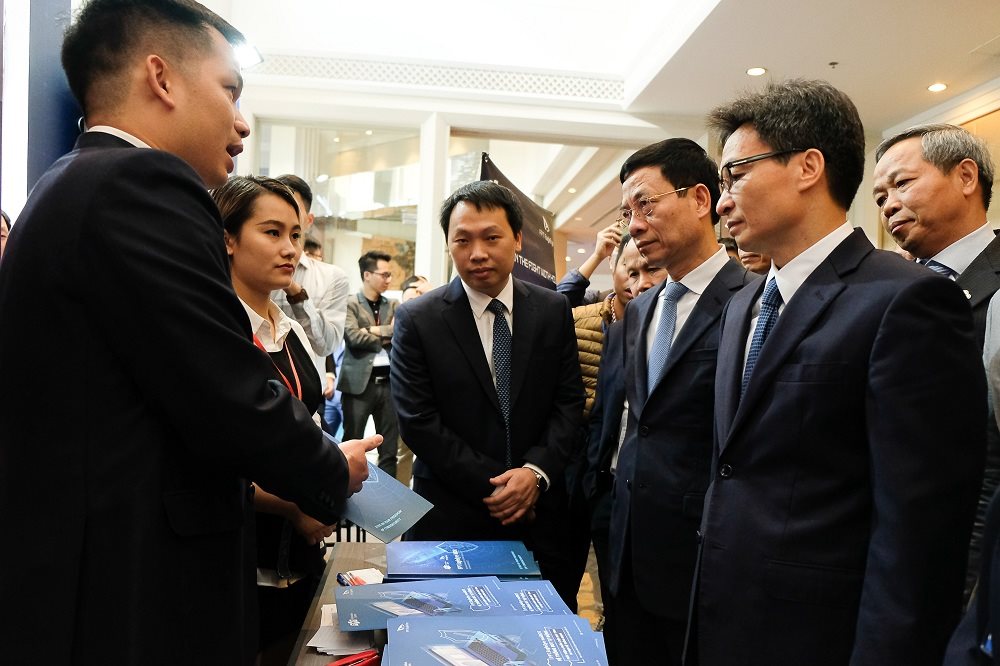 Phó Thủ tướng Vũ Đức Đam và Bộ trưởng Bộ TT&TT Nguyễn Mạnh Hùng thăm qua gian hàng các sản phẩm ATTT của FPT. |