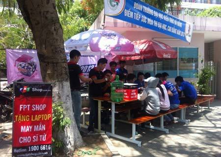 | Trong thời gian nghỉ trưa, các bạn sĩ tử ngồi nghỉ ngơi và tham gia chương trình “Laptop may mắn cho sĩ tử” từ FPT Shop (Ảnh tại Đà Nẵng). |