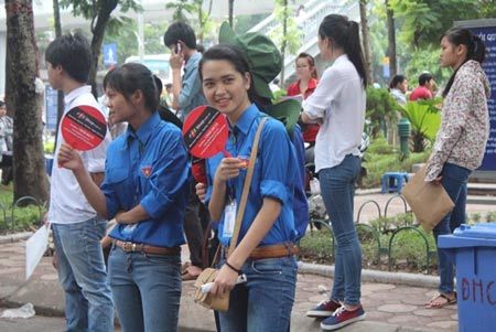| “Cho tớ xin một cây quạt nào!” - Các nữ tiếp sức mùa thi duyên dáng (Ảnh tại Hà Nội). |