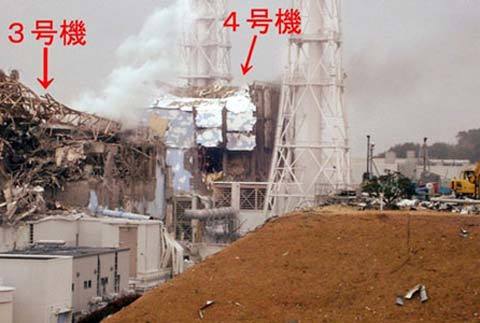 Lò phản ứng số 3 và số 4 tại Fukushima I bị hư hại sau các vụ nổ, ảnh được Công ty điện Tokyo (Tepco) công bố ngày 16/3. Ảnh: Kyodo. |