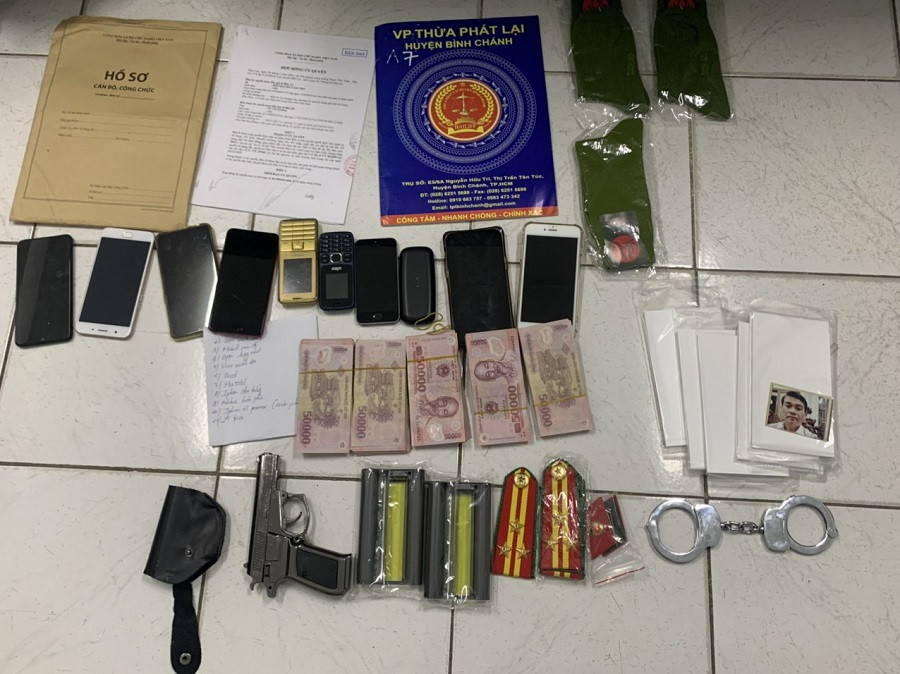 Để tạo lòng tin, Lập chụp nhiều hình ảnh mặc sắc phục Công an nhân dân, hình ảnh súng, còng số 8 để gửi qua cho người phụ nữ này.