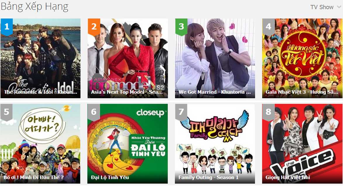 Cơn gió Valentine 2014 cũng được thể hiện rõ nét qua BXH khi chương trình cũ mang chủ đề tình yêu đôi lứa We Got Married của Hàn Quốc thu hút lượt xem đột biến. Cặp đôi Nichkhun & Victoria thuộc chương trình đang nắm giữ vị trí thứ 3 BXH và cặp đôi Seohyun & Jung Yong Hwa xếp ở vị trí thứ 9.