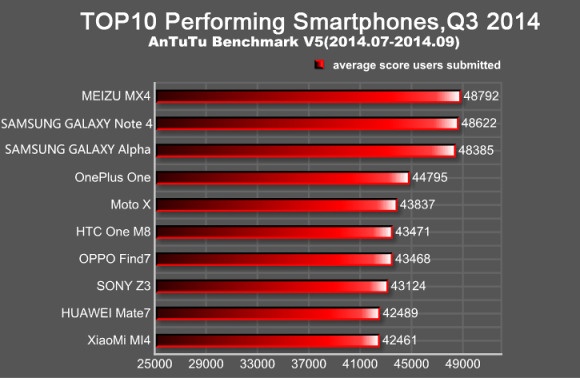 Antutu đã benchmark mỗi smartphone ở 160 quốc gia khác nhau rồi chọn ra điểm số cao nhất của smartphone đó đi "tranh tài" với các đối thủ khác. Họ làm vậy bởi với mỗi smartphone, các nhà sản xuất thường sử dụng CPU khác nhau cho các thị trường khác nhau. Kết quả cuối cùng là MX4 đạt số điểm 48.792, và hai vị trí xếp ngay sau là Galaxy Note 4 với 48.622, còn Galaxy Alpha là 48.385.