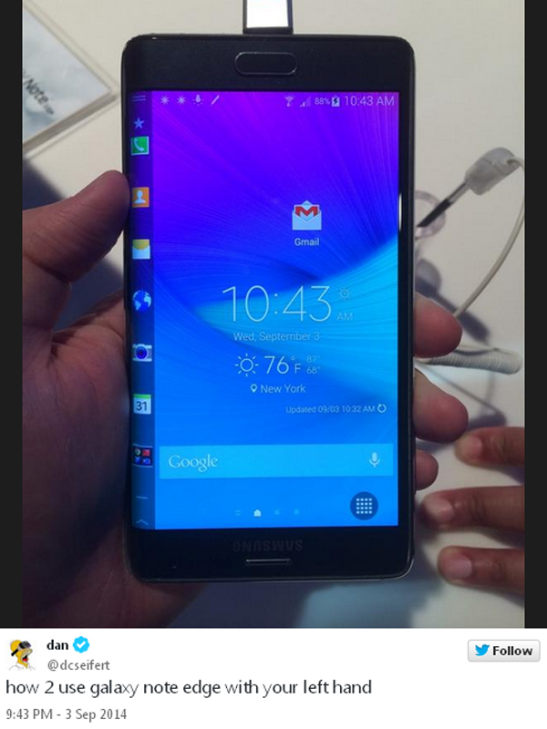 Lo lắng trên có vẻ có cơ sở. Samsung vừa giới thiệu mẫu smartphone Galaxy Note Edge được các trang tin công nghệ đánh giá là “hoàn toàn mới”. Theo trang The Verge, với màn hình cong như thế này, người dùng sẽ rất dễ “cầm thiết bị sai cách” và dẫn đến những trải nghiệm “lạ lùng”. Một người dùng Twitter đã ngay lập tức đăng tải câu hỏi: Làm thế nào sử dụng Galaxy Note Edge bằng tay trái? Lời đăng này đã được khá nhiều người đồng tình và đăng lại.