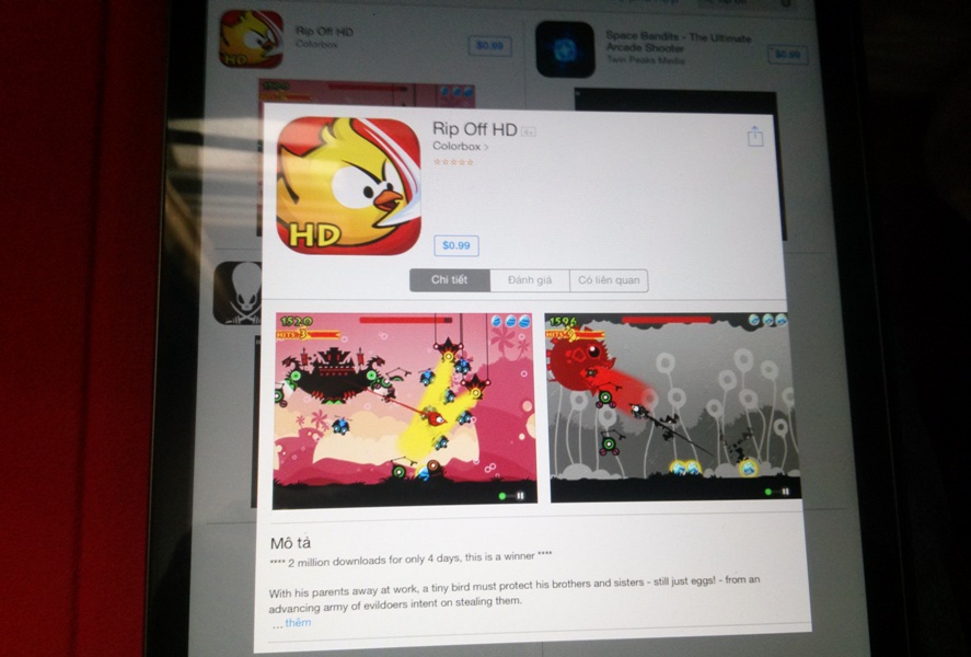 Nhưng đáng chú ý nhất phải nói đến các sản phẩm của 2 công ty Color Box và Pine Entertainment với hai sản phẩm là Rip Off và Pocket Army. Mặc dù không đứng hạng đầu trong bảng xếp hạng App Store như Flappy Bird của Nguyễn Hà Đông, nhưng game Rip Off (được Color Box bán 0.99USD trên App Store), đã từng gây tiếng vang lớn khi chỉ 4 ngày đã có tới 2 triệu lượt tải từ người dùng, trong khi đó Pocket Army là game miễn phí nhưng cũng lọt vào thứ hạng khoảng hơn 200 trong kho ứng dụng của Apple trong thời gian dài, theo một nguồn tin cho biết, doanh thu game có ngày lên đến cả tỷ đồng Việt Nam.