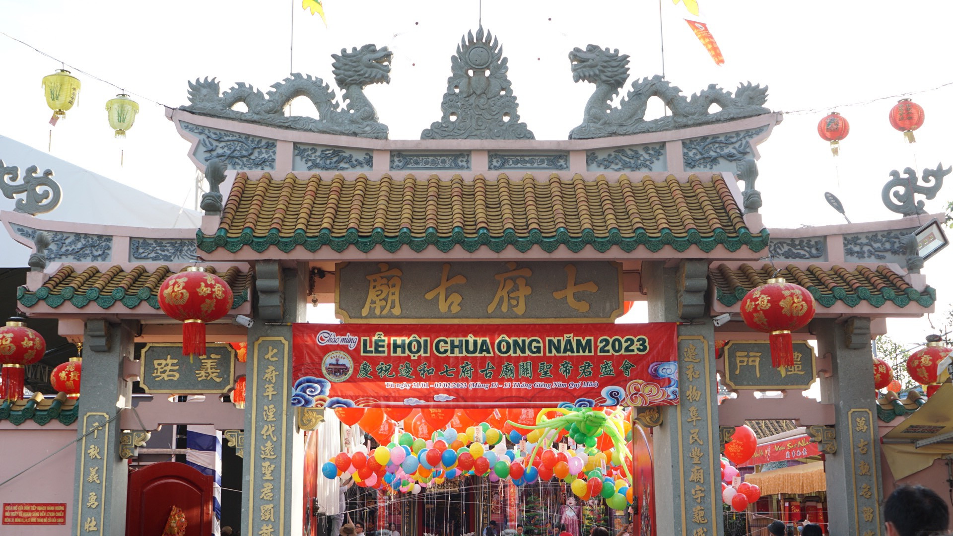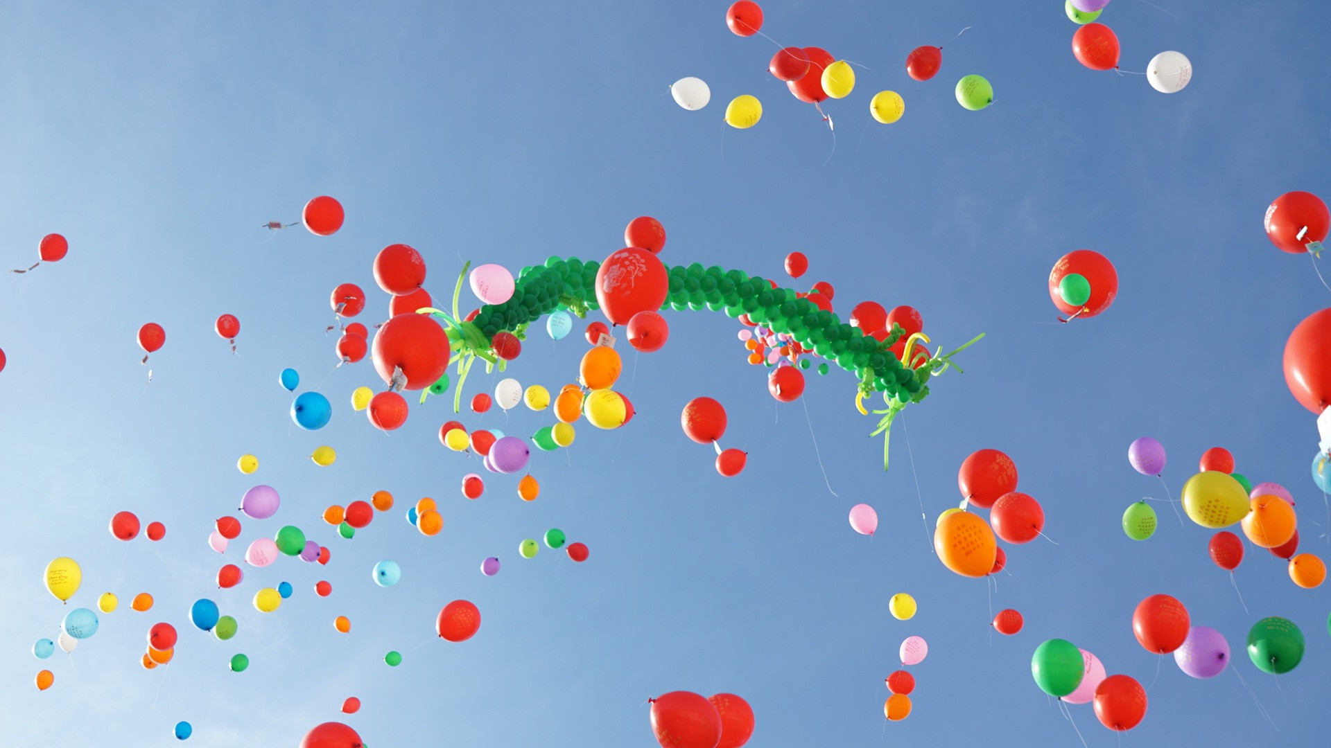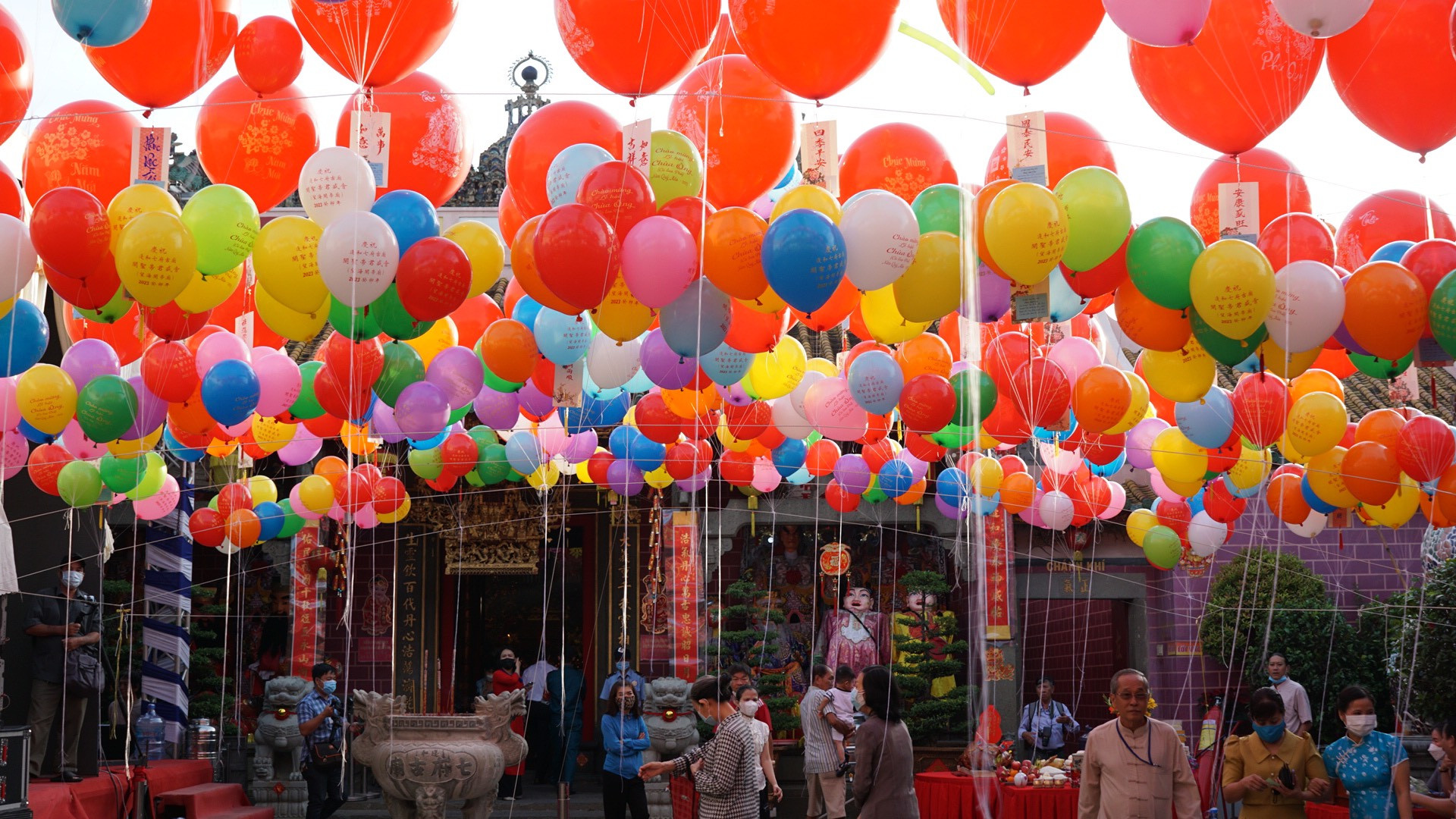 Sau khi làm lễ xong, con rồng xanh làm bằng bong bóng và gần 1.000 quả phúc khí cầu mang theo lời cầu nguyện của mọi người được thả lên trời.