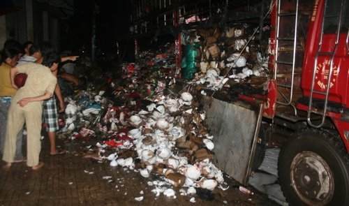 Tại hiện trường, khối hàng hóa đủ loại bị hư hỏng vương vãi khắp mặt đường. Theo đánh giá của nhiều người, trị giá thiệt hại về tài sản có thể lên đến 1 tỉ đồng.