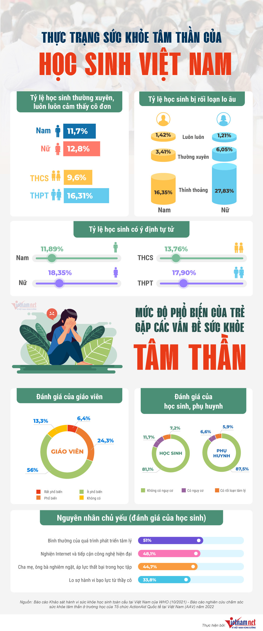 Theo một số nghiên cứu, khảo sát hành vi sức khỏe tâm thần học sinh Việt Nam, tỷ lệ nữ sinh có ý định tự tử cao hơn nam. Bên cạnh đó, 16,31% học sinh THPT thường xuyên cảm thấy cô đơn.