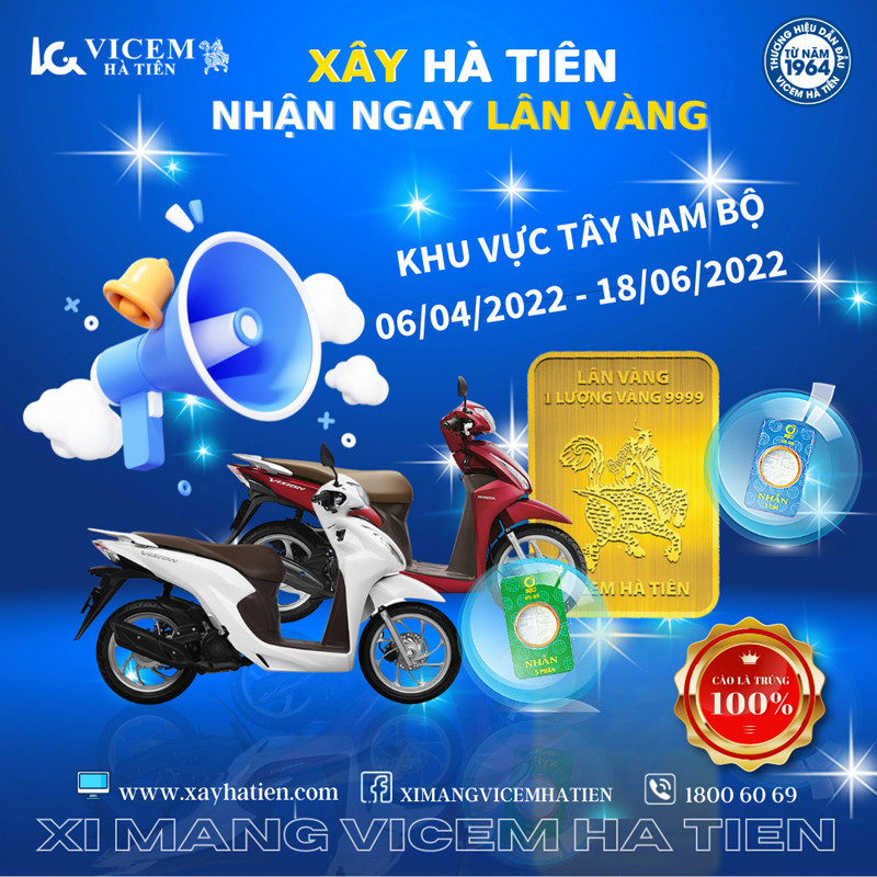 Xây Hà Tiên - Nhận ngay Lân Vàng diễn ra từ ngày 06/04 - 18/06/2022, nhằm tri ân khách hàng đã luôn đồng hành cùng thương hiệu xi măng Vicem Hà Tiên. Thông qua chương trình, Vicem Hà Tiên cũng mong muốn mang hình ảnh biểu tượng Kỳ Lân Xanh đến gần hơn với người tiêu dùng. Đây là một trong những hoạt động ý nghĩa, nằm trong kế hoạch kích cầu của doanh nghiệp. Chương trình còn giúp giới thiệu bao bì mới và sản phẩm xi măng chất lượng cao đến tay khách hàng. Đồng thời thắt chặt mối liên kết giữa Vicem Hà Tiên với các đối tác, nhà phân phối, người tiêu dùng…