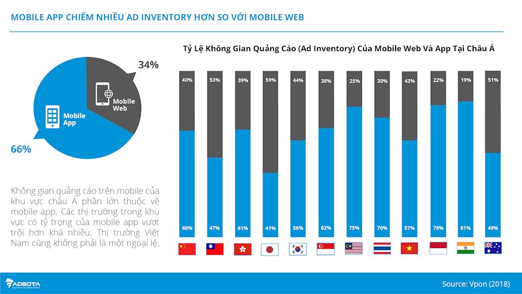 Xu hướng nổi bật không kém của thị trường mobile khu vực châu Á nói chung và Việt Nam nói riêng năm 2019 là sự chênh lệch không gian quảng cáo giữa mobile app và mobile web khi các ứng dụng luôn luôn có nhiều không gian dành cho các nhà quảng cáo hơn các mobile site.