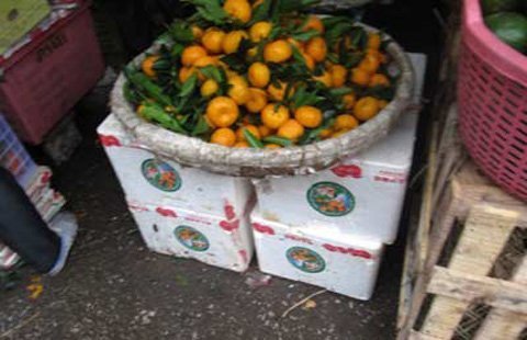 Tại chợ Nhà Xanh (Cầu Giấy, Hà Nội), chúng tôi hỏi mua quýt về bày tiệc đám cưới, người bán hàng hăm hở chào hàng: “quýt Sài Gòn ngon lắm em. Hàng nhà chị là hàng nội đấy. Nếu mua chị lấy 250.000 đồng/thùng 13 kg”.