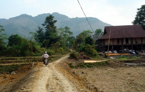 Nhà anh Dương Đình Hùng ở đầu bản, nằm ở khu dân cư vừa mới mở, có chừng bốn, năm nóc nhà. Chiếc nhà gỗ vợ chồng anh đang cất dở, mới xong bộ khung cột, còn trống nguyên phần tường nhà.