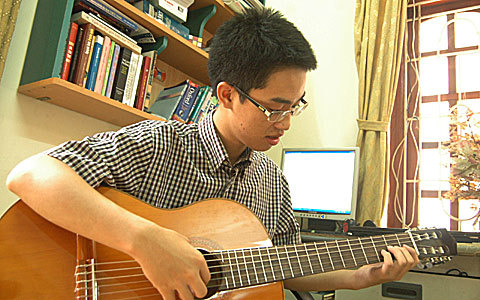 | Kim Lâm bên cây đàn ghi-ta mới được bố mẹ mua cho để theo học trong thời gian chờ nhập học. |