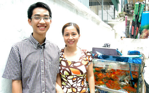 | Kim Lâm chụp chung với mẹ, cô Nguyễn Thị Vân Lan trên đường đẩy xe bán cá cảnh về nhà. |