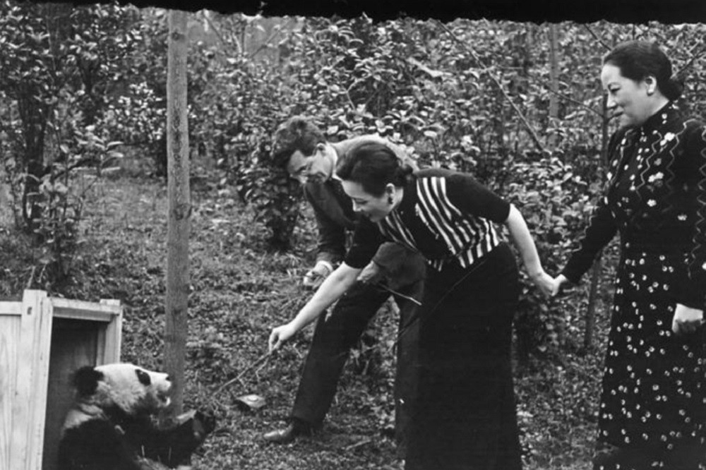 Bà Tống Mỹ Linh (giữa) đưa cho chú gấu một cành trúc. Ảnh: zhihu.com