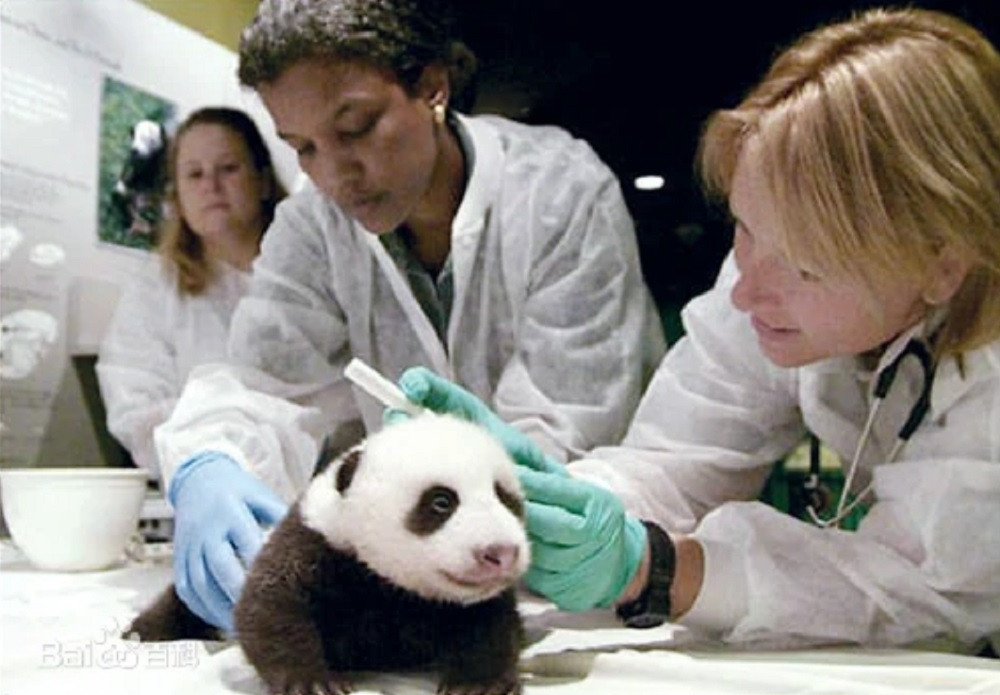 Các bác sĩ Mỹ kiểm tra sức khỏe một chú gấu trúc non. Ảnh: Baidu